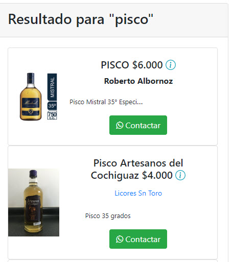 1. Buscar dentro de tu comunidad. Busca tu comunidad y seleccionala, al seleccionar tu comunidad esta quedara activa mientras dure tu visita a MercApp.cl y puedes buscar tus producto, donde te saldra una lista de productos y sus precios, por ejemplo pisco: