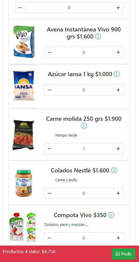 2. Por la vitrina, si necesitas hacer una compra de más productos puedes buscar la vitrina de tu vecino, o seleccionarlo desde un producto, ya que si tu vecino tiene la vitrina activa, el nombre de la vitrina aperecera en color azul. O puedes hacerlo desde el selector de las vitrinas en la página inicial de MercApp. Una vez en la vitrina puedes seleccionar los productos y cantidades que necesites, en la parte inferior, se iran sumando los productos y cantidades.